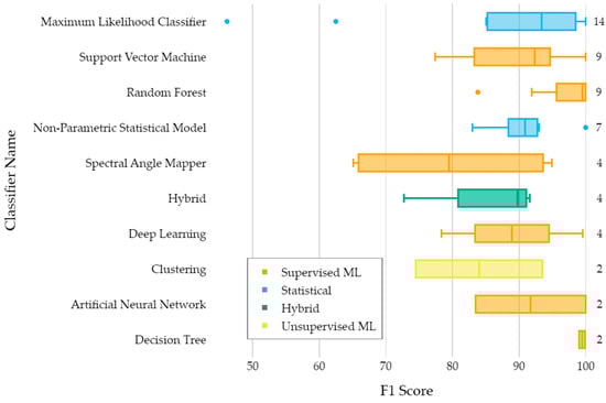 Likewise, while Artificial Neural Networks (ANNs) exhibit promising F1 scores, the limited number of studies reduces confidence in their generalisability. Support Vector Machines (SVMs), although represented in 11 studies, had a median F1 score of 92.3% but with greater variability than ANN and RF (ranging from 77.4% to 100%). This variability suggests that SVM performance is dependent on factors such as dataset characteristics, parameter tuning, and study design. Statistical models such as the Maximum Likelihood Classifier (MLC) show broader variability of 46.2% to 100%, with a median F1 score of 93.4%, indicating potential sensitivity to study-specific conditions. The lack of sufficient data for certain classifiers, particularly hybrid approaches and underrepresented supervised methods, underscores the challenge of making comprehensive comparisons, emphasising the need for more studies to establish their effectiveness and consistency across diverse applications.