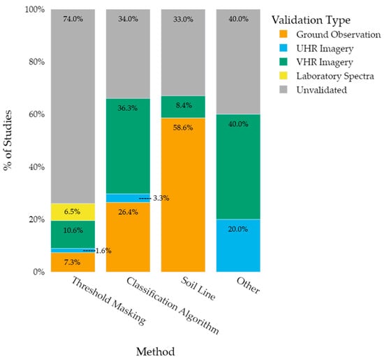 Threshold masking approaches have used a mix of validation techniques, including VHR imagery (44%) and ground observations (29%). However, the relatively low validation rate suggests that threshold masking approaches may not be as rigorously tested as other methodologies, leaving room for further verification. Meanwhile, other novel methods have mainly utilised VHR imagery (67%), suggesting that for less common BS identification techniques, high-resolution imagery plays a crucial role in validation. The limited use of laboratory spectra for validation across all methodologies (the highest usage was only 21% in threshold masking) suggests that laboratory-based validation may be less practical for BS studies. This could be due to logistical challenges or the preference for validation methods that capture real-world conditions more effectively, such as ground observations and remote imagery. The heavy reliance on VHR imagery for many methodologies, particularly for classification algorithms, underscores the increasing availability and usefulness of high-resolution imagery in reducing the need for labour-intensive ground validation. However, Figure 8 also highlights that different validation methods are favoured based on the specific requirements and challenges of each BS identification approach, reflecting the adaptability of validation techniques to the unique characteristics of each methodology.