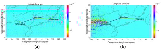 For example, using three eLoran stations and two GNSS satellites numbered 1 and 2, the simulation region is set to latitudes between 18° and 28° and longitudes between 102° and 122°, with an altitude of 400 m and a clock bias of 0. The simulation uses a step size of 0.2°. The pseudorange data used for eLoran and GNSS are calculated using Formulas (2) and (4), respectively. After substituting the results into the newly derived eLoran/GNSS combined positioning algorithm for solution, the positioning errors are calculated and presented in the figure below.