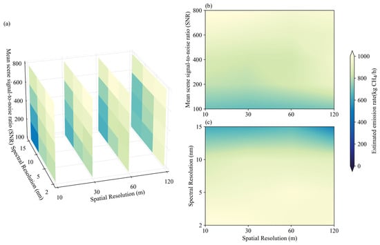 | Satellite | Spatial Resolution | Spectral Resolution (Average FWHM) | SNR | Predicted Emission Rate (kg/h) | Retrieved Emission Rate (kg/h) | Type of Spectrometer | Reference |