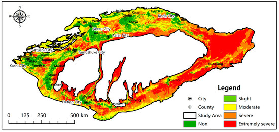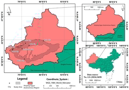 The study area is situated in the Ring-Tarim Basin, Xinjiang, China, bordered by the Tianshan Mountains to the north and flanked by the Arjinshan and Kunlun Mountains to the southeast and southwest, respectively. The geographic coordinates of the region are 35°59′24″N to 42°1′34″N and 74°18′53″E to 91°24′15″E. This basin falls within the continental arid climate zone, characterized by hot and dry conditions, with an average annual temperature of approximately 10.7 °C. The area experiences significant annual and diurnal temperature fluctuations, limited precipitation (ranging from 17.4 mm to 42.8 mm annually), and high potential evapotranspiration (between 1800 mm and 2900 mm). These distinctive geographic and climatic factors contribute to the region’s heightened susceptibility to desertification [19]. This study specifically targets areas vulnerable to desertification, excluding the central desert region of the Taklamakan Desert [20,21]. The elevation within the study area ranges from 702 m to 3526 m, with the highest elevations primarily located along the periphery. The total area of the study region is 3.294 × 107 km2, and the location is shown schematically in Figure 1 as the shaded portion.
