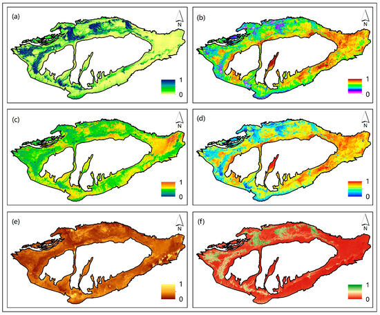 The inversion result diagram of index based on GEE in 2020: (a) FVC. (b) TVDI. (c) Albedo. (d) LST. (e) TGSI. (f) MSAVI.