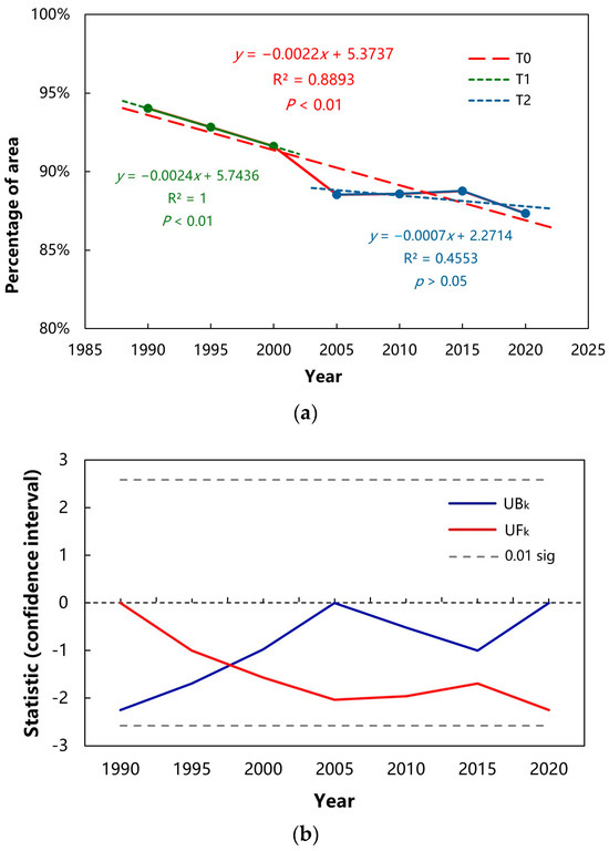 The Mann–Kendall test is a non-parametric statistical test that is less susceptible to a small number of outliers, and it does not require the data series to follow a specific distribution. In this study, the significance level α is set at 0.01, with the corresponding critical value U±0.01 is ±2.576. The sequences and are the statistical series calculated based on the forward and backward orders of the time series, respectively. When and intersect within the critical region, the time corresponding to their intersection marks the onset of the original time series mutation. If > 0, the sequence exhibits an upward trend; conversely, a downward trend is indicated if < 0. The change in the original time series is considered significant when the curve lies outside the critical value [45]. The principle is as follows: