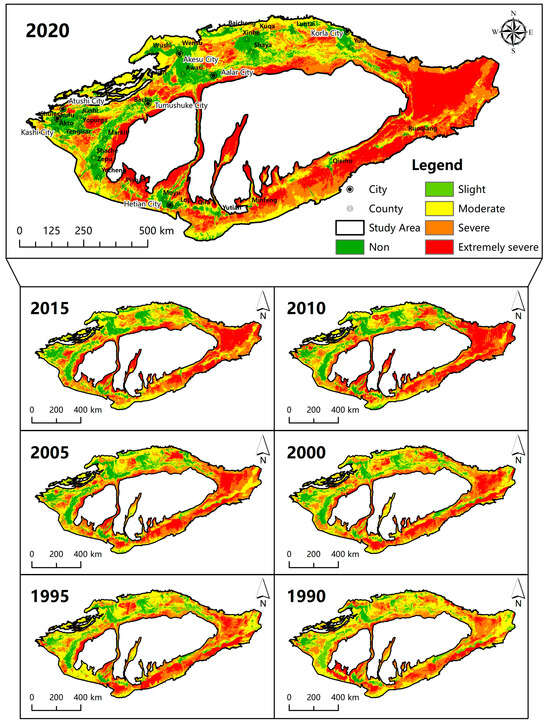 - During the period of 1990–2020, the proportion of desertified area in the Ring-Tarim Basin showed a significant downward trend, with an average annual reduction rate of −0.0022 hm2/a, and the non-desertified area increased year by year, indicating that the ecological environment of the region continued to improve. Despite the deterioration of localized areas, the overall trend is “generally positive and locally controlled”. The degree of desertification in the western and northern parts of the region is less serious than that in the eastern and southern parts, and the non-desertified areas are mainly concentrated in oases and are showing an expanding trend. The reversal of desertification mainly occurs in the slight and moderate desertification areas at the edge of oases, and the comprehensive desertification management has begun to yield results. Changes in the degree of desertification mainly occur between neighboring degrees, and changes of more than two degrees are rare, which does not show a trend of continuous intensification of desertification.