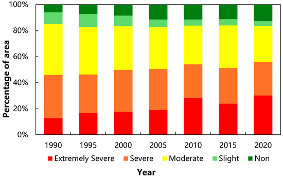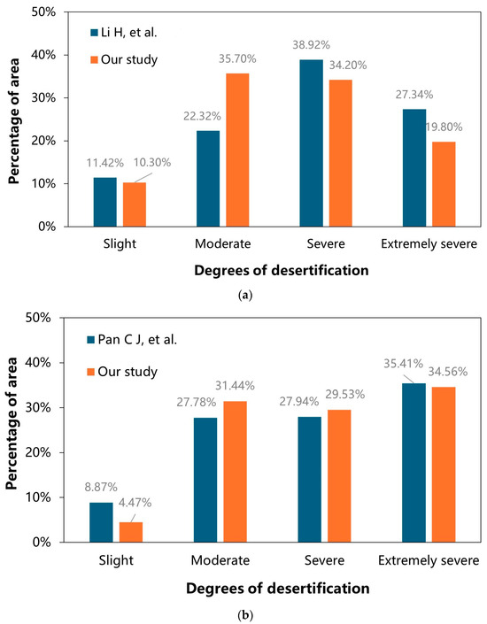 Percentage of different degrees of desertification before and after the Ring-Tarim Basin mutation year ([48,49] and our study): (a) 2000. (b) 2005.