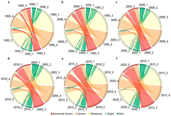 This study calculated the spatial and temporal trends of the center of gravity shift for all degrees of desertified land across seven periods based on the center of gravity shift model, with the spatial distribution and changes illustrated in Figure 13. The concept of the center of gravity originates from physics and refers to a point in space where the forces exerted in all directions are in relative equilibrium. The center of gravity transfer model, derived from Newton’s law of universal gravitation, serves as a mathematical framework for analyzing the spatial trajectories of various factors and the degree of balance in regional development over time. This model has become an essential analytical tool, widely employed in fields such as economics, geography, and other related disciplines. From the figure, it is evident that the center of gravity of desertified land at all degrees generally exhibits a trend of shifting from east to west. Notably, slightly desertified land has the largest transfer distance among all degrees of desertification. Moderate desertified land exhibited an east-to-west transfer across all seven periods. Severely desertified land exhibited the smallest shift distance among all degrees of desertification. The centers of gravity for severe and extremely severe desertification lands are closely located, with a consistent migration direction that shows a fluctuating westward migration trend. The most typical watershed in the study area is the Tarim River Basin, located in the northeastern part of the country. Before 2000, the uncontrolled use of water resources due to population growth led to a decline in groundwater levels in the Tarim River Basin, further exacerbating the degree of land desertification in the Ring-Tarim Basin [3,52]. Since the Chinese government initiated the ecological water transfer project in 2000, the groundwater level in the Tarim River Basin has risen after four water transfers, leading to the restoration of the neighboring ecological environment [53,54]. The weakening of desertification in the Tarim River Basin has resulted in a general trend of shifting the center of gravity of desertified land in the study area from east to west. The distribution of extremely severe desertified land is more concentrated, with no widespread degradation or deterioration of vegetation cover.