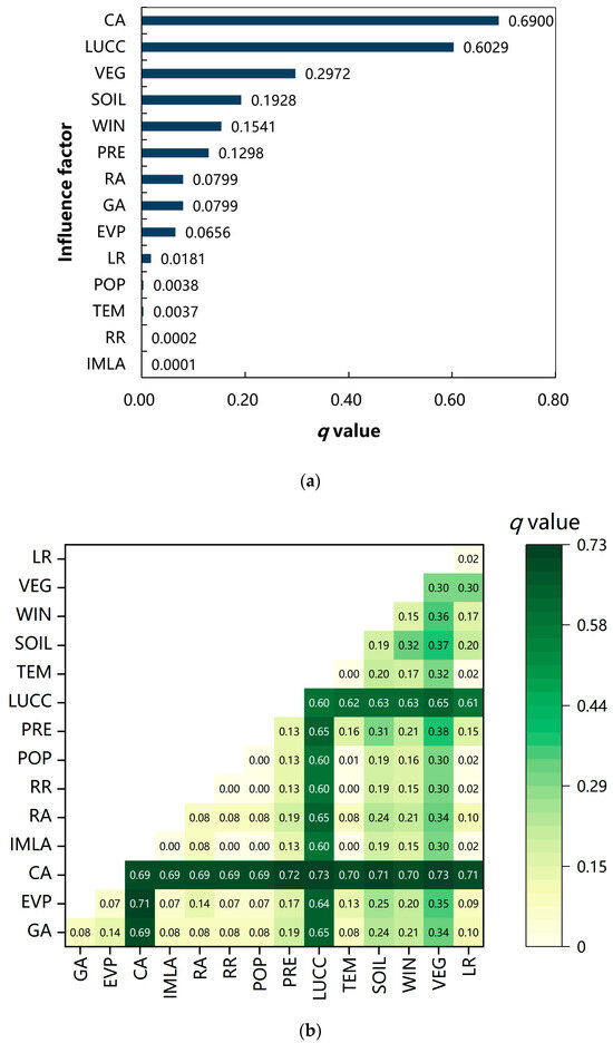 To investigate the influence of anthropogenic and natural factors on the spatial differentiation of desertification extent in the Ring-Tarim Basin region, this study utilized a total of 14 natural and anthropogenic factors as inputs, as listed in Table 3, and analyzed the influence of each factor using GeoDetector [50]. Figure 12a illustrates the histogram of q-values representing the explanatory power of individual factors on the DCI. In the ranking of explanatory power for each factor related to the spatial differentiation of desertification, cultivated land area (0.6900) and land use type (0.6029) emerged as the most significant factors. In contrast, reclamation rate (0.0001) and industrial and mining land area (0.0002) were the least significant factors. The total number of factors with explanatory power greater than the mean (0.1656) is four, with two factors related to both anthropogenic and natural influences. Among these, the anthropogenic factors are cultivated area (CA) and land use type (LUCC), which together have a total explanatory power of 1.2928; the natural factors are vegetation type (VEG) and soil type (SOIL), which together account for an explanatory power of 0.4900. In summary, the most significant single factor affecting the spatial divergence of desertification degree is cultivated land area, indicating that the degree of desertification is primarily influenced by human activities [51].