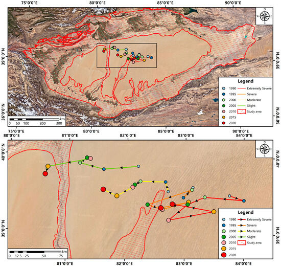 Trend map of center of gravity shift for desertified land in the Ring-Tarim Basin.