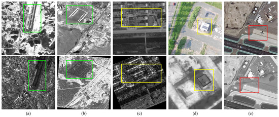Example of multi-source remote sensing images. In (a–c), the top are optical images, and the bottom are SAR images. In (d,e), the visible images are above, and the infrared images are below. A significant nonlinear radiation difference can be observed in the green boxes of (a,b). There are significant geometric and viewing angle differences in the yellow boxes of (c,d). In the red box of (e), it can be observed that the objects change in the images at different times. The above multiple differences are coupled with each other, posing challenges to multi-source remote sensing image registration tasks.