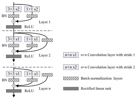 and , respectively, represent the input reference image and sensed image, . and are input into Siamese four-stage encoders, where each stage consists of a stride-2 convolution layer and several stride-1 convolution layers stacked in a single branch, as shown in Figure 3. In the stride-2 convolution layer, the input feature map undergoes two parallel 3 × 3 convolutions, 1 × 1 convolutions, and batch normalization (BN) layers, Finally, there is a rectified linear unit (ReLU). The stride-2 convolution layer can obtain a feature map with half the size. In the stride-1 convolution layer, the output feature map size remains unchanged. And the stride-1 convolution layer adds an identity branch of residual connections to suppress the loss of deep convolution information. The above process can be expressed mathematically as follows: