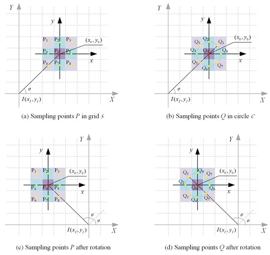 where denotes the angle between the line connecting and the coordinate system origin and the coordinate axis, i.e., . For the convenience of comparing the distribution of sampling points between rotation-invariant convolution and plain convolution, we provide the distribution maps of both (taking as an example), as shown in Figure 4c,d. It is not difficult to observe that, unlike the grid distribution with fixed sampling points in plain convolution, the distribution of rotation- invariant sampling points depends on the position of the action point .
