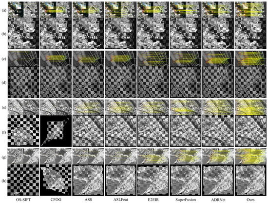 (1) Comparison on SOPatch dataset. We use the SOPatch dataset to validate the effectiveness and universality of our method in optical–SAR remote sensing image registration. Table 2 compares the quantitative performance of our method with other advanced methods on the SOPatch dataset. It can be seen that our method achieved the best performance in all indicators. Compared with the suboptimal method, our approach reduces RMSE by 19.20% and improves to 92.96%. We can also find that deep learning-based registration methods generally perform better than artificial feature-based registration methods. This demonstrates the potential of deep networks in mining robust and reproducible features. In addition, in order to more intuitively compare the performance of our method with advanced methods, we provide examples of visualized registration results in the figures. As shown in Figure 6a,c, compared with other advanced methods, our method obtains more correct matching point pairs. Due to the proposed rotation-invariant multiscale encoder and cross-domain-aware high-order structural feature decoder, our method achieves better perception of stable and reliable keypoints and fewer erroneous matches from more challenging scenes, as shown in Figure 6e,g. As shown in Figure 7, we use checkerboard patterns to demonstrate the registration results of the proposed CRS-Net and observe details.