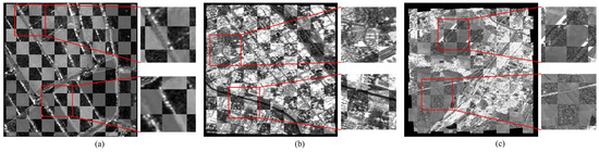 The registration results of the proposed CRS-Net, with zoomed-in red-boxed areas of checkerboard patterns provided for observing details. (a–c) are different scenes in the SOPatch dataset.