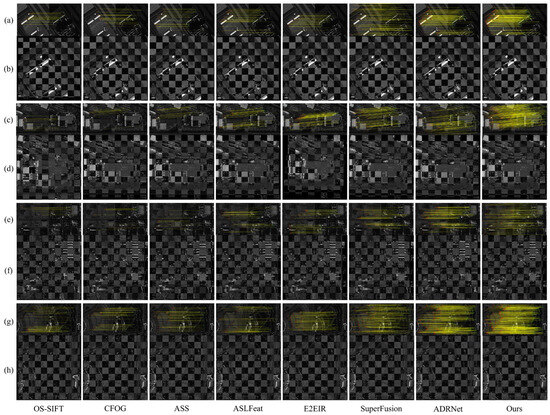 Examples of registration results using different methods on the VEDAI dataset. (a,c,e,g) are keypoint pairs connected by lines. (b,d,f,h) are checkerboard patterns.
