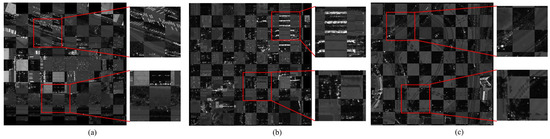 The registration results of the proposed CRS-Net, with zoomed-in red-boxed areas of checkerboard patterns provided for observing details. (a–c) are different scenes in the VEDAI dataset.