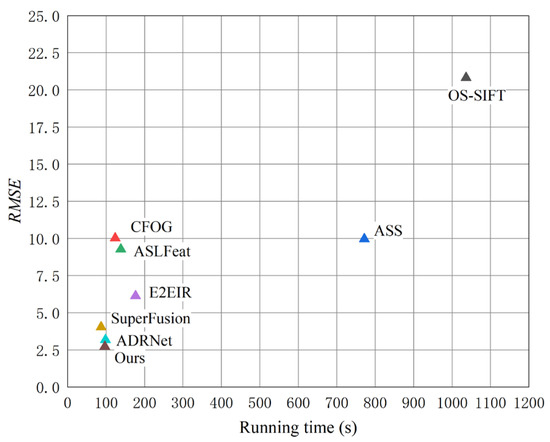 We randomly select 100 pairs of multi-source remote sensing images from the OSEval dataset for experiments and calculate the registration speed of different methods, as shown in Table 4 and Figure 15. The reason for selecting 100 sets of test cases instead of only 1 set is to eliminate the impact of scene complexity on algorithm running efficiency. Considering that the shorter the running time and higher the RMSE of the registration algorithm, the more practical the registration algorithm, the method closer to the bottom left corner in the figure has better performance. The results indicate that our proposed registration method maintains competitiveness in terms of operational efficiency while achieving good accuracy.