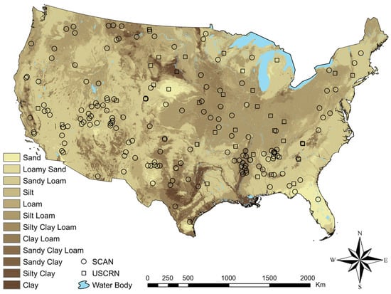 Spatial distribution of USDA soil textural classes for surface layer (0–10 cm) produced from SOLUS100 maps along with the location of SCAN and USCRN soil moisture networks across the CONUS.