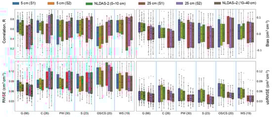 The error metrics of surface and subsurface SM estimation using the ConvLSTM and scenarios 1 and 2 (S1 and S2) for various land cover types (from MODIS satellite product) against SCAN and USCRN in situ SM and NLDAS-2 SM products (test set). The land cover type classes include Grassland (G), Cropland (C), Permanent Wetlands (PW), Savannas (S), Open Shrublands and Closed Shrublands (OS/CS), and Woody Savannas (WS). The numbers in parentheses represent the number of soil moisture stations (SCAN and USCRN) in each land cover type.
