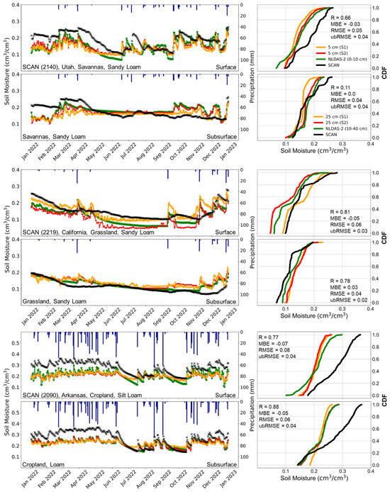 Temporal dynamics of surface and subsurface SM from the ConvLSTM model (scenarios 1 and 2 and NLDAS-2 against in situ SM for three SCAN sites (the blue bars depict precipitation) (left); and the associated cumulative distribution function (CDF) curves (right) (In each graph, the black represents in situ measurements, the green shows the NLDAS-2 SM, and the orange and red depict ConvLSTM SM estimates for scenario 1 and scenario 2, respectively).