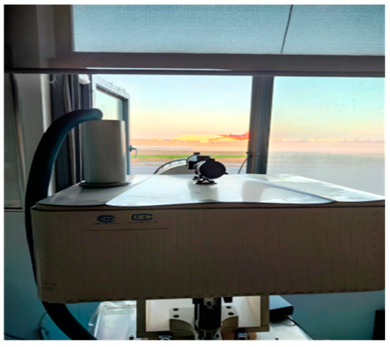 The receiving and reflecting mirrors of the OP-FTIR system are mounted on a stable steel platform, positioned at a height of 1.5 m. The total optical path length of the OP-FTIR system, measured using a laser rangefinder, is approximately 485 m. As depicted in Figure 3, the OP-FTIR system’s optical path traverses the aircraft taxiway and the takeoff and landing runway, enabling the direct acquisition of aircraft exhaust emissions under actual conditions. The actual online monitoring of the OP-FTIR system is shown in Figure 4.