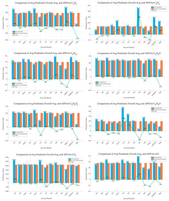 The actual observed emissions and model-predicted emissions for different aircraft models are visualized, as shown in Figure 8. In this figure, APD represents the relative impact of each aircraft model on a specific pollutant. If APD > 0, it indicates that the average pollutant concentration for that aircraft model is higher than the overall average. If APD < 0, it indicates that the average pollutant concentration for that aircraft model is lower than the overall average.