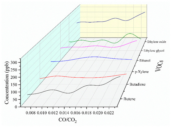 3.2.3. The Correlation Between CO/CO2 Ratio and the Concentration of Each VOC