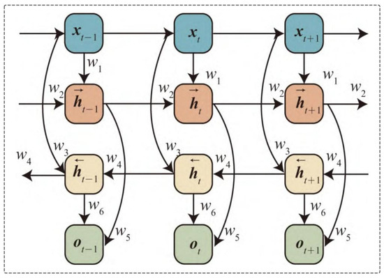 where h t , h t and o t are the outputs of the forward hidden-layer state, reverse hidden-layer state and hidden-layer state at moment t , respectively; x t is the input feature vector at moment t ; f is the LSTM cell function; g is the ReLU function; and w = ( w 1 , w 2 , w 3 , w 4 , w 5 , w 6 ) is the weight vector.