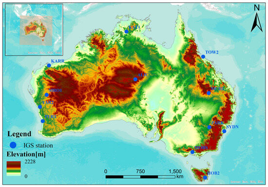 Figure 4. A map of the study area. The blue dots represent the locations of the IGS stations.