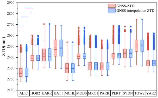 Figure 5. Comparison of the box plots of ZTD before and after interpolation for each IGS station used in this study. The line in the middle of the boxes represents the mean level of the data. In contrast, the upper and lower edges of the boxes correspond to the upper and lower quartiles, respectively, indicating the variability of the data. Points outside the boxes represent outliers in the data.