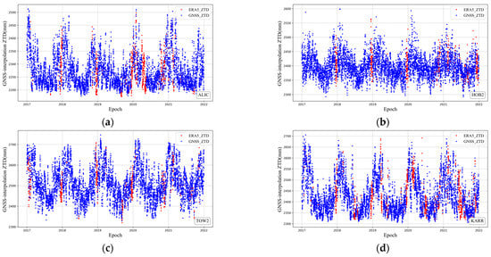 Figure 6. GNSS interpolation ZTD from 2017 to 2021 for the IGS stations selected in this study. Panels (a), (b), (c) and (d) represent the ALIC, HOB2, TOW2 and KARR stations, respectively.