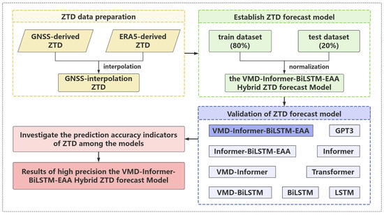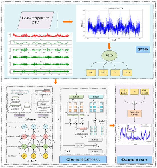 Figure 8. Flowchart of the VMD-Informer–BiLSTM-EAA hybrid ZTD prediction model.