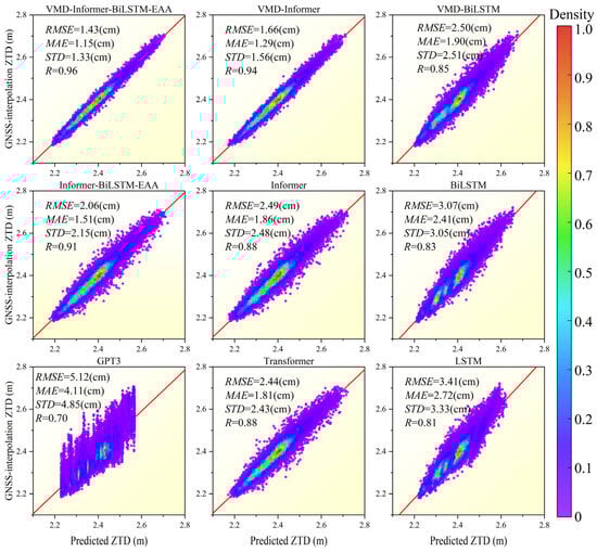 Figure 9. Comparison of ZTD predictions between different models. The model proposed in this paper is VMD–Informer–BiLSTM–EAA.