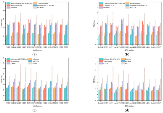 Figure 10. Comparison of prediction accuracy indices of different ZTD prediction models for each station. (a) Comparison of RMSE without VMD method (b); comparison of MAE without VMD method (c); comparison of RMSE in the case of using the VMD method (d); comparison of RMSE in the case of using the VMD method.