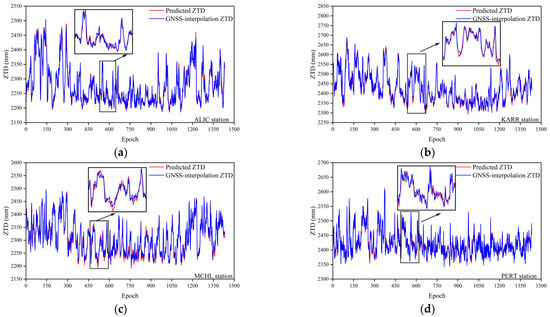Figure 11. Comparison of the prediction results of the VMD-Informer–BiLSTM-EAA hybrid ZTD prediction model with the GNSS interpolation ZTD. The horizontal coordinates represent the predicted moments for each day in 2021 (0:00, 6:00, 12:00 and 18:00), and the vertical coordinates represent the ZTD values. Panels (a), (b), (c) and (d) represent the ALIC, KARR, MCHL and PERT stations, respectively.