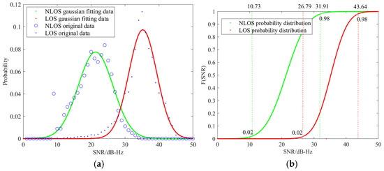 The SNR data of satellites are collected in the occluded environment and the open environment. Based on the distribution of SNR values, the data are subjected to Gaussian fitting. As a result, the probability density curves and probability distribution curves of SNR under NLOS and LOS conditions are obtained, respectively, as shown in Figure 3. Using the Z-test with a confidence level of 0.98, the right-side unilateral test is performed on the NLOS signals probability density curve to obtain the rejection region [31.91, 50.00]. The left one-sided test of the LOS signals probability density curve is performed to obtain the rejection region [0, 26.79]. The candidate points are scored according to the rules in Table 2.