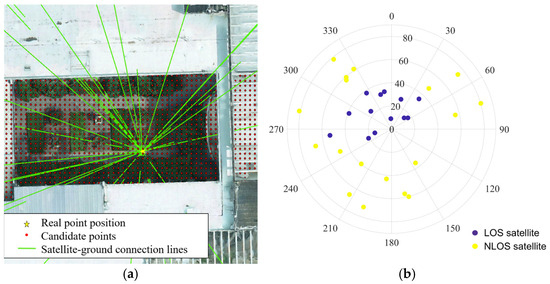 where Si is the score assigned to the candidate point by the i-th satellite on the candidate point, n is the total number of satellites, G is the total score of the candidate point, is the coordinates of the k-th high-score candidate point, Gk is the score of the k-th high-score candidate point, m is the number of candidate points in the top 5% of the score, and “5%” is an empirical value. is the result of shadow matching. The positions represented by and are in geodetic coordinate system.
