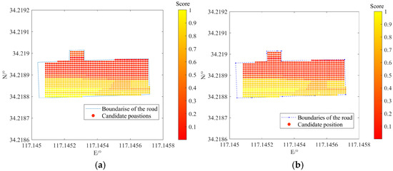 where Gi is the score of the i-th local candidate point, GH is the average of the first 20 points with higher scores, GL is the average of the last 20 points with the lowest score, “20” is an empirical value, is the normalized score of the i-th candidate point, m is the number of candidate points with a normalized score greater than 0.98, and Pos is the positioning result.