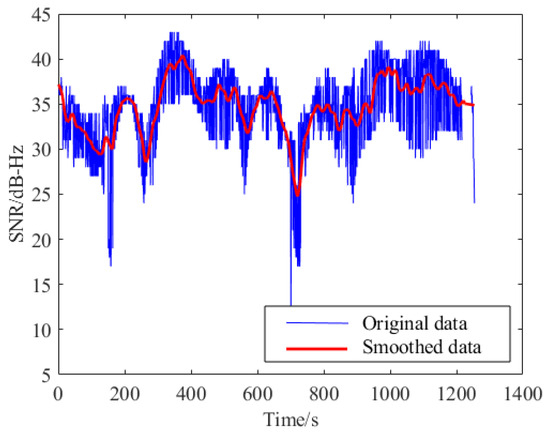 where is the smoothing factor, k is the k-th epoch, I is the i-th satellite received by the k-th epoch, is the SNR of the i-th satellite of the k-th epoch, is the smoothed SNR, is the epoch of signal unlocking, and is the time threshold of the signal unlocking of filter reset. When the signal of a satellite is disconnected for more than , the filter of the satellite is reset, which is not affected by the previous epoch. Taking the C35 satellite of BeiDou Navigation Satellite System (BDS) as an example, the situation before and after SNR smoothing is shown, as shown in Figure 8.