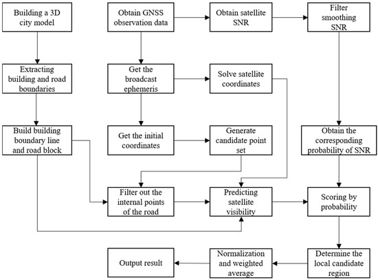 Compared with the original process, the new algorithm process eliminates the need for basic shadow matching while keeping the road block where the local candidate region is located unchanged. Additionally, the new algorithm process omits the step of constructing the sky shadow map, effectively decreasing the computational cost of satellite visibility prediction. Similar to the original algorithm, the improved algorithm still needs to extract building and road data before subsequent calculations.