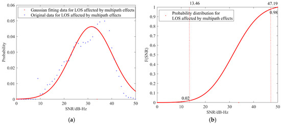 LOS signal (affected by multipath effects): (a) probability density curve; (b) probability distribution curve.