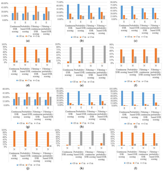 In both experimental groups, the N direction shows a higher proportion of errors within 0~7 m compared to the E direction. Meanwhile, Figure 12 reveals that, after SNR smoothing, the error distribution becomes more concentrated in smaller error ranges, indicating that low-pass filtering significantly improves positioning accuracy. Additionally, in static experiments, the probability-based SNR scoring method demonstrates a less pronounced improvement in accuracy compared to the continuous SNR scoring method.