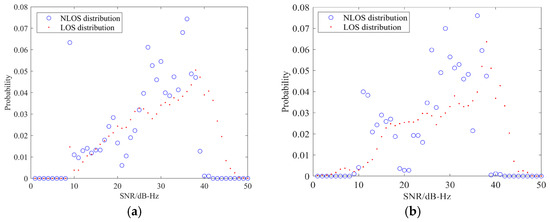 The experimental environment includes complex urban environments such as urban canyons and semi-shielded environments, and satellite signals are susceptible to multipath effects. Therefore, in the experiment group 1, the candidate points are scored according to the SNR distribution of NLOS and LOS signals, as shown in Table 2 and Table 3. In the experiment group 2, the candidate points are scored according to the SNR distribution of the LOS signal which is affected by multipath effects and the NLOS signal. This is to compare the impacts of different prior SNR information on the positioning results. The SNR data were collected in the semi-shielded environment and the urban canyon environment, and the SNR probability density curves and distribution curves under the LOS condition affected by multipath effects were obtained, as shown in Figure 11.
