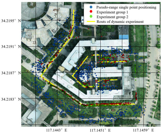 The experimental results demonstrate that utilizing the probability density and probability distribution information of NLOS and LOS signals as scoring references achieves higher positioning accuracy compared to using such information affected by multipath effects. Furthermore, the improved algorithm shows insufficient enhancement in positioning accuracy for static measurements, whereas in the dynamic measurement results of Experimental Group 1, it achieves 20–30% accuracy improvement over the original algorithm. On two dynamic experimental routes, the positioning accuracies of the improved algorithm reached 2.57 m and 2.16 m.