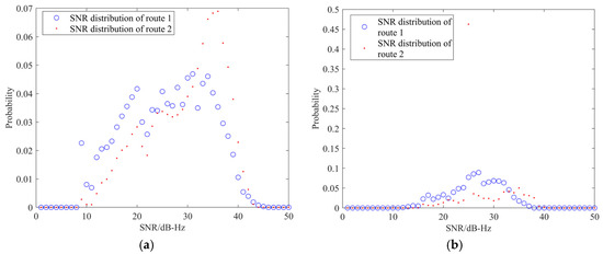 The distribution of SNR origin data of route 1 and route 2: (a) the distribution of SNR origin data; (b) the distribution of SNR smoothed data.