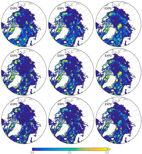 Compared to the other experiments, significant eddy contributions to ocean dynamics in the Arctic can be observed in EXP2 during the summertime (central panels for surface expression, bottom panel for 3D results), when the sea-ice concentration and extension are lower and sea-ice fractures (leads, polynyas) can be more persistent. Eddy contributions are also prominent along the Greenland Current and in the Labrador Sea, where surface REKE values (central panels) are up to the order of those observed in the Nansen Basin. It is also interesting to notice how considering enhanced altimetry data makes it possible to resolve signature mesoscale features in the shelf-break branch of the Arctic Circumpolar Boundary Current along the East Siberian shelf [71], which accounts for a large portion of the fresh water content in the Arctic [72] that, in turn, influences the spatial variability of the sea-level trends in the region [24].