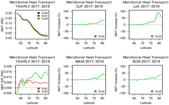 Meridional heat transport (MHT). The panels show the MHT in the experiments, obtained considering a latitudinal range between 61°N and 82°N during 2017–2019 (top left), as a difference with respect to EXP0 (bottom left) and as a percent difference between EXP2 and EXP1 during winter (DJF), spring (MAM), summer (JJA) and autumn (SON) over the period 2017–2019.