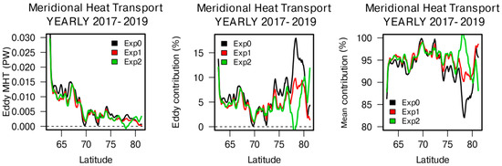 Following a simple decomposition of the time-averaged transports in mean (i.e., stationary) and eddy components (see e.g., [73]), we show the absolute values of the eddy MHT transports in the three experiments, and the percentage of each of the two in Figure 5. The percentage of eddy contribution decreases poleward, similar to the total MHT, and fluctuating between 0 and 15%, with an average value between 60°N and 80°N equal to 6.6, 5.0, and 4.5% for EXP0, EXP1, and EXP2, respectively. This suggests that the enhanced altimetry does not dramatically change the fraction of eddy-induced transports compared to the mean MHT variations, in agreement with similar findings for the North Atlantic Ocean [74], which stress how spatial resolution refinements mostly act on the mean state of the ocean. Locally notable variations (i.e., at 78°N) correspond to the Fram Strait; transport through its narrow section are likely spuriously affected by the different observational sampling across the experiments.