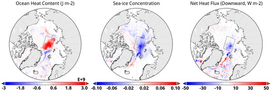Time-averaged difference of ocean heat content (full column, left panel, in J m−2), sea-ice concentration (middle panel, dimensionless), and net downward heat flux (right panel, in W m−2) between experiments EXP2 and EXP1. The black rectangle identifies the region where the heat budget analysis was performed.