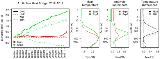 This is summarized in Figure 7 (left panel) as a time series in units of (cumulated) heat. Compared to EXP1, EXP2 exhibits a significant increase in both the assimilation and the lateral transport. Variations in net downward heat flux are smaller and tend to compensate for the other two, as found in similar studies (e.g., [75]) where data assimilation is found to partly counteract variations in heat fluxes (and vice versa). In particular, we found that the assimilation and transports led to a 69% and 64% increase in OHC, partly offset by larger heat losses to the atmosphere, meaning that warming is almost equally due to local (data assimilation increments) and remote (lateral transports) effects. Within the warming study region, vertical profiles of mean temperature, mean cumulated analysis increments, and the differences between EXP2 and EXP1 are shown in the right panels of Figure 7; the profiles indicate that EXP2 is warmer than EXP1 in the vertical region between the mixed layer and about 400 m of depth and that warmer analysis increments are visible between 50 and 800 m of depth. This confirms that local data assimilation contributes significantly to high-latitude warming, but that the assimilation of enhanced altimetry data also induces a remote effect, visible as a shift of the warming core towards the surface and its amplification due to both lateral transport and vertical mixing.