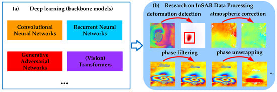 Deep learning (DL) techniques, rooted in neural networks, have emerged as effective methodologies for analyzing large InSAR datasets, driving significant advancements in InSAR processing. These techniques have achieved notable developments, particularly in the classification of deformation features and noise reduction. DL has been instrumental in the identification and localization of deformation phenomena associated with volcanic activity, landslides, and earthquakes [2,9,31,32,33,34,35,36,37,38], as well as in time-series-based deformation prediction [39,40] and subsidence monitoring [41]. Moreover, DL methods have been effectively applied across various stages of InSAR data processing, including phase unwrapping, phase filtering, and atmospheric correction, significantly reducing noise and artifacts in interferograms (Figure 1). These contributions highlight the transformative potential of DL in enhancing the accuracy and efficiency of InSAR analysis.